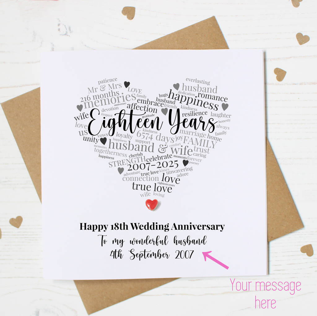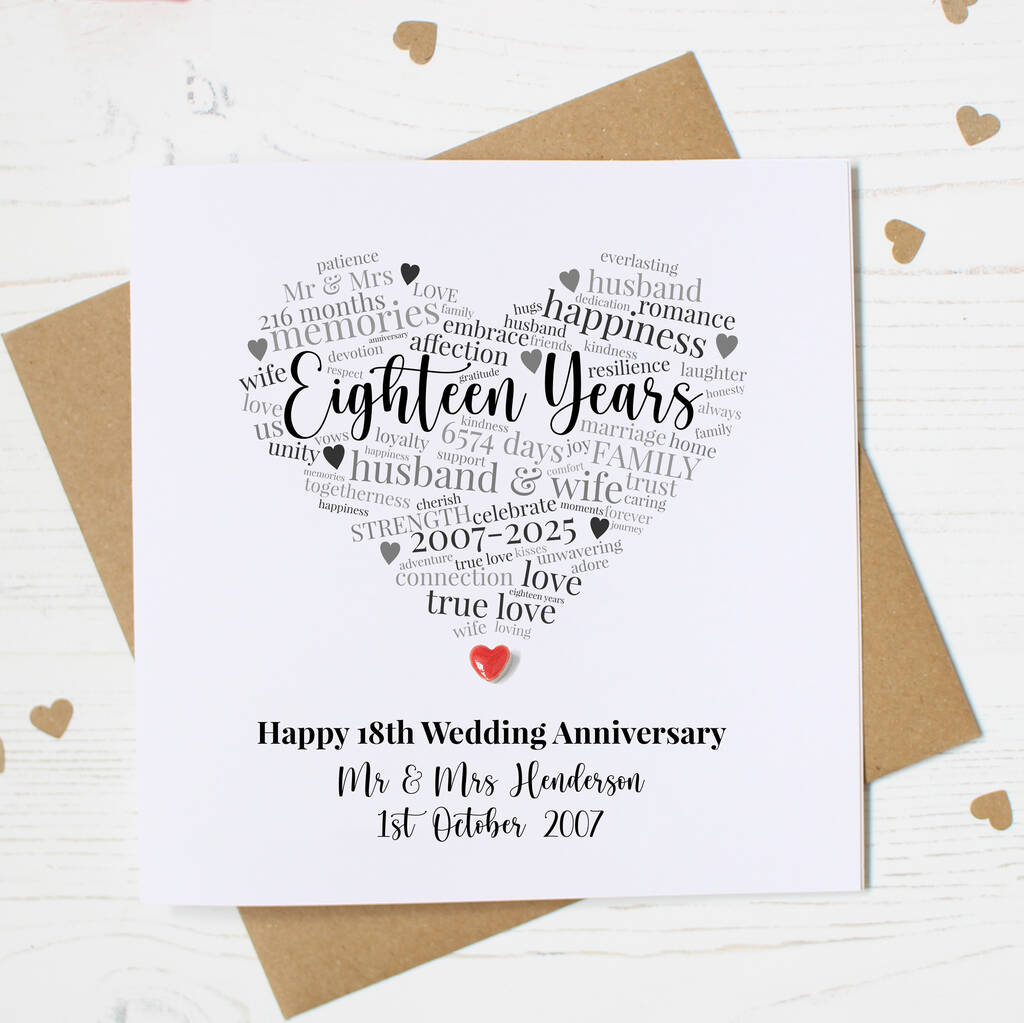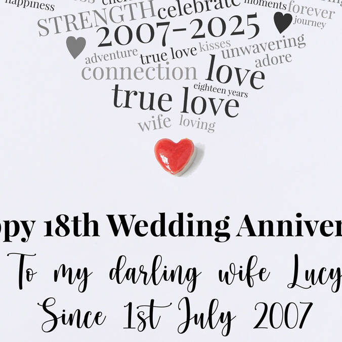 Celebrate 18 years of love with this elegant 18th anniversary card featuring a handmade kiln fired clay heart for a symbolic and stylish touch.