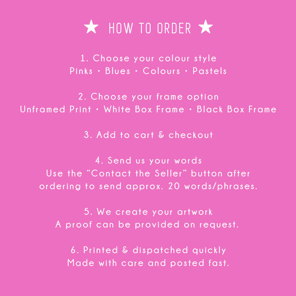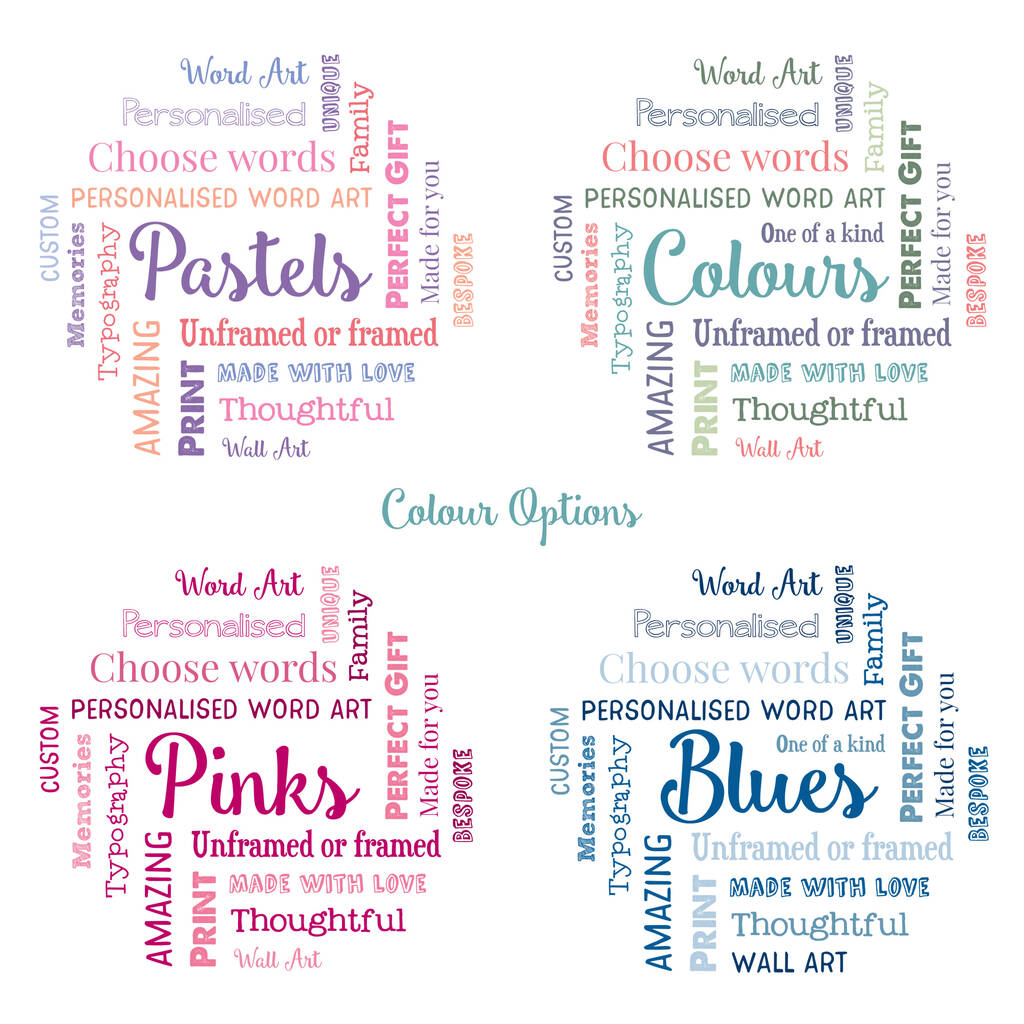 With four gorgeous colour styles to choose from – Pinks, Blues, Colours, or Pastels – and the option of an unframed print or a sleek white or black box frame, this personalised wall art fits perfectly into any home.