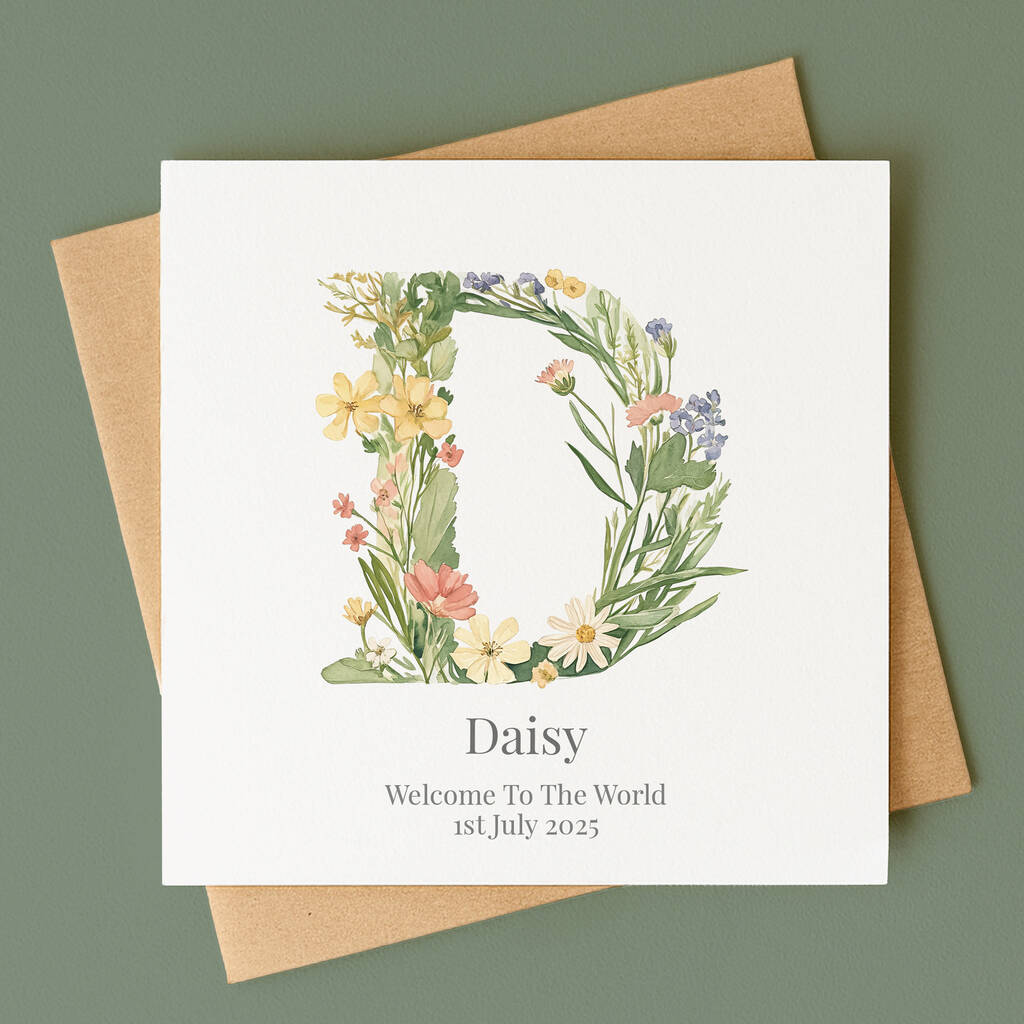 This personalised botanical initial card is the perfect way to celebrate a very special new baby!