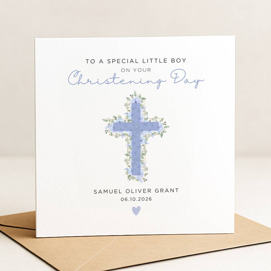 Personalised Floral Cross Christening Card For Baby Boy