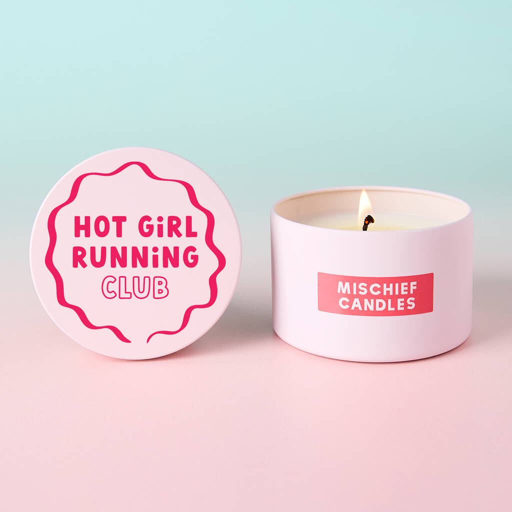 For the runners (and the “run once, talk about it for months” girls). A pink tin candle with red bow artwork, here to power your hot girl jogs - or post-run baths. The cheeky design reads 'hot girl running club' in a cute red font.