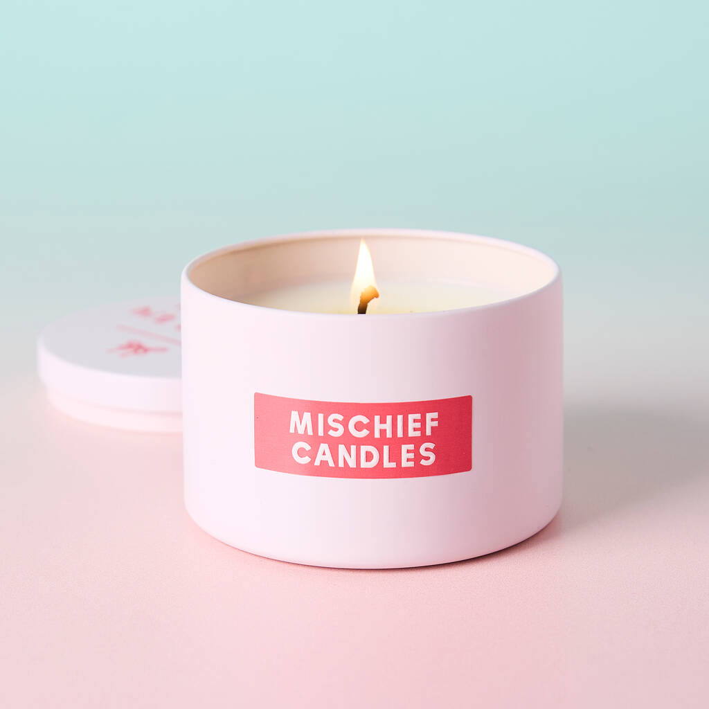 Each Mischief Candles tin is hand poured in Manchester and crafted from 100% natural soy wax for a clean, even burn. Housed in our signature pink tin with bold red design details, every candle is made to stand out on your shelf (and your socials).
