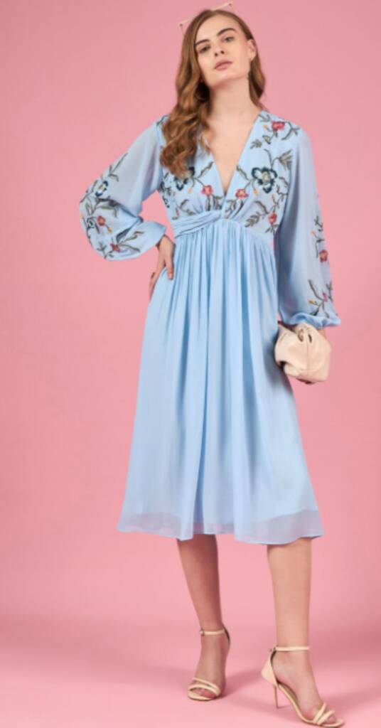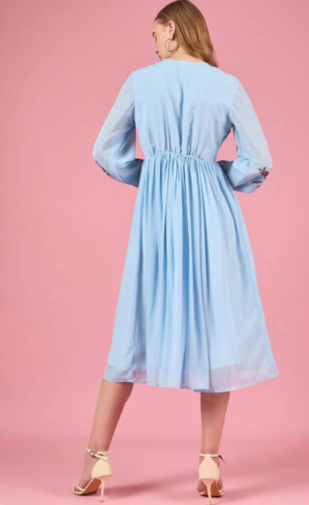 Floral Embroidered Puff Sleeve Chiffon Fit And Flare Midi Dress