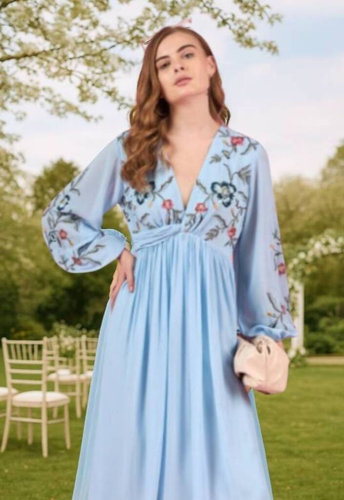 This enchanting midi dress combines delicate craftsmanship with refined elegance. Rendered in flowing chiffon, it features exquisite floral embroidery that adds visual interest and sophistication. The flattering V-neckline and voluminous puff sleeves create a romantic silhouette, while the gathered waist and gracefully flared skirt provide a flattering fit. Perfect for special occasions or elevated everyday wear, this blue dress embodies timeless style and understated luxury.