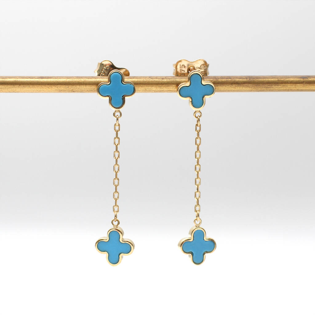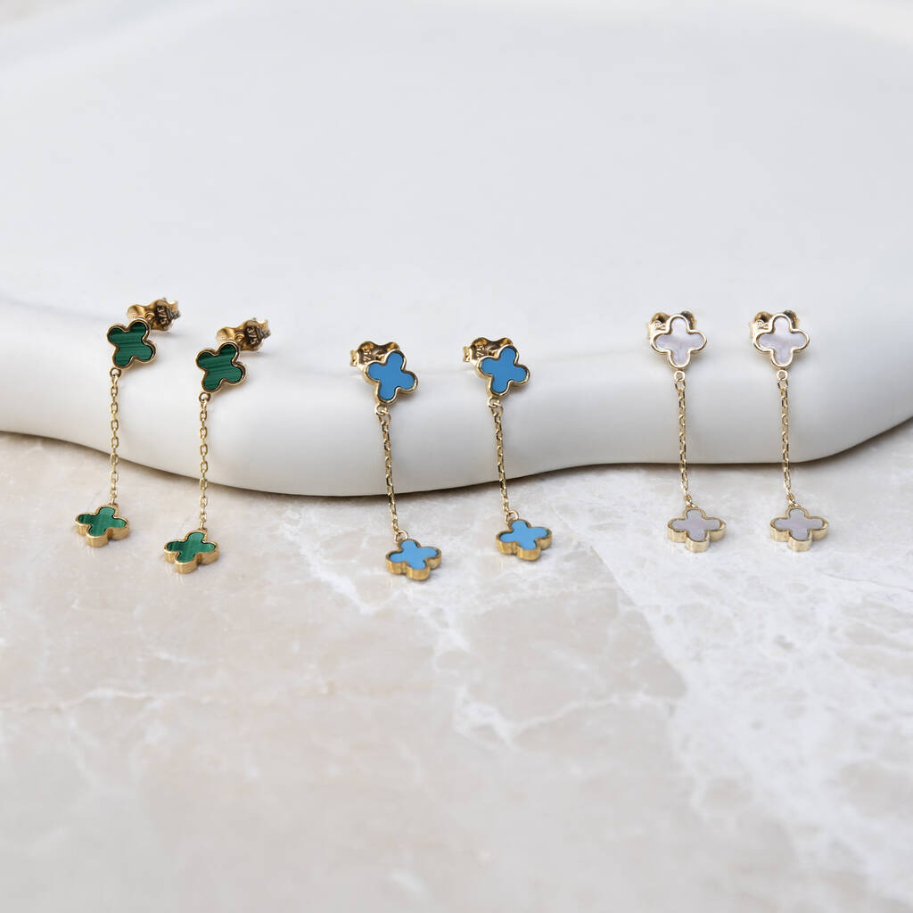 These graceful gold drop clover earrings feature two exquisite mother of pearl, turquoise or malachite flowers in a sleek and delicate drop design. Each flower is individually set in a smooth gold bezel, showcasing the beauty of the four delicate petals.