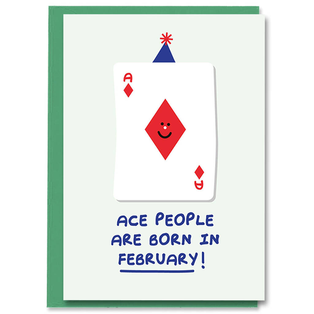 Cute, funny, quirky illustrated smiley face diamond ace playing card February happy birthday card to celebrate a fun aquarius, pisces star sign birthday card