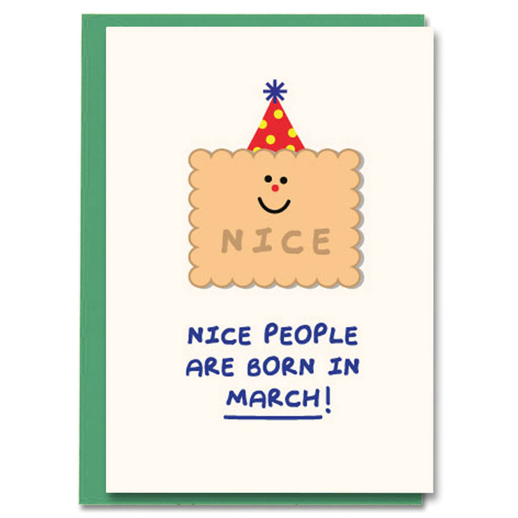 Fun, quirky March birthday card for him, her with illustrated smiley party hat nice biscuit, perfect gift for Pisces or Aries star sign birthdays.