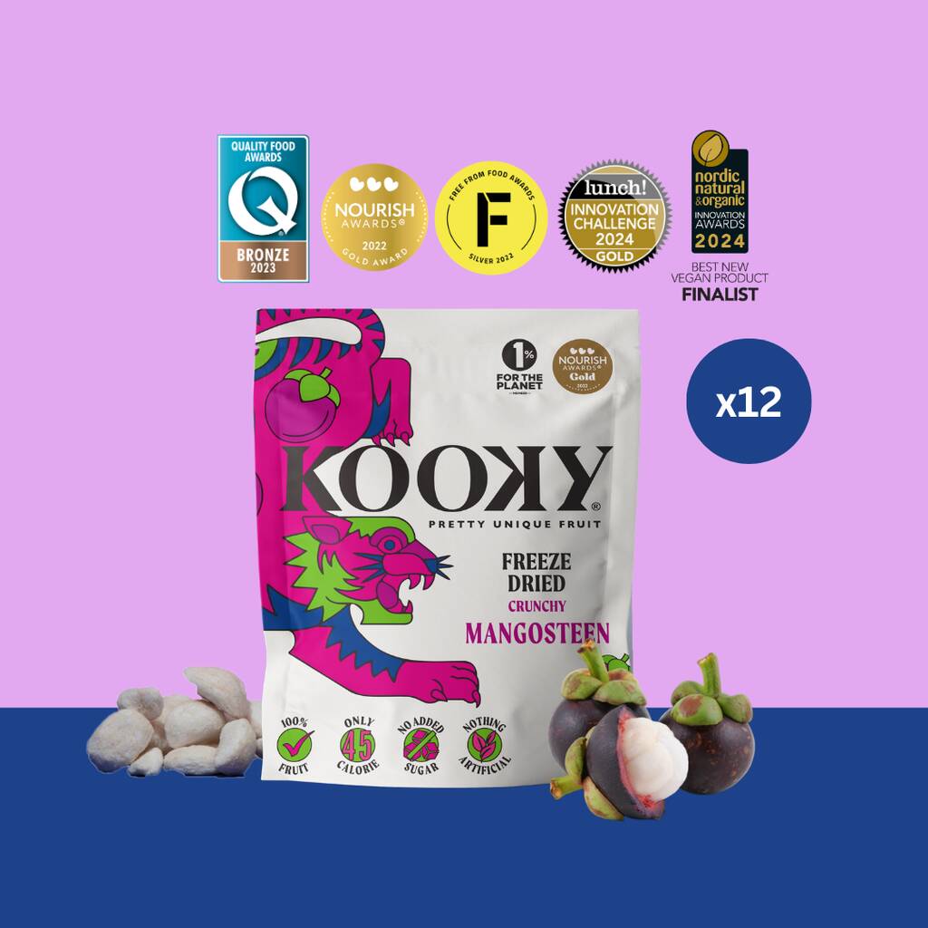 Regarded as the "Queen of Fruits", Mangosteen contains Xanthones, a special class of antioxidants that combat oxidative stress and inflammation. High in Potassium, Manganese, Folic Acid and Vitamin C, this is the jewel of our Kooky crown and each pack contains whole mangosteens!
