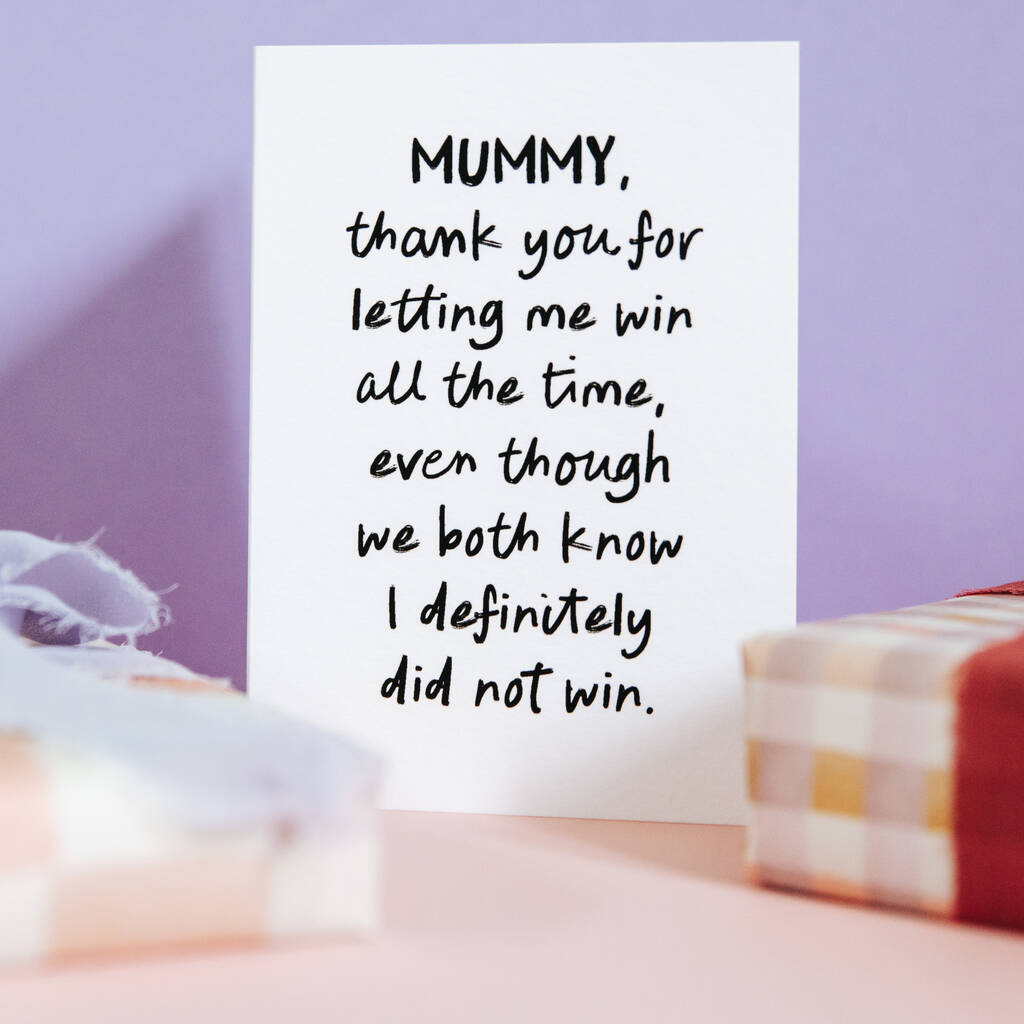 The front of the card reads: “MUMMY, thank you for letting me win all the time, even though we both know I definitely did not win.” Because the name can be personalised to Mummy, Daddy, Mama, Dad, or any other nickname, it feels like a private joke shared just between the two of you. It is a humorous and evocative way to acknowledge their patience and the little sacrifices they make to keep the fun going.