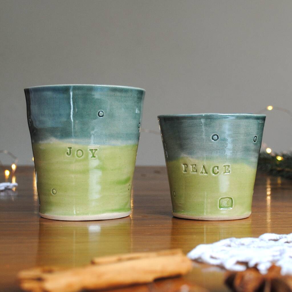 Each mug, tumbler has these three words Peace, Joy, and Love stamped into the clay. It's hand brushed with forest green and lime green glaze. Each mug is unique, no two pieces are exactly the same.