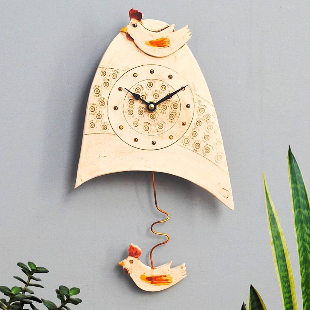 Handamde Chicken Wall Clock With Cockerel Pendulum
