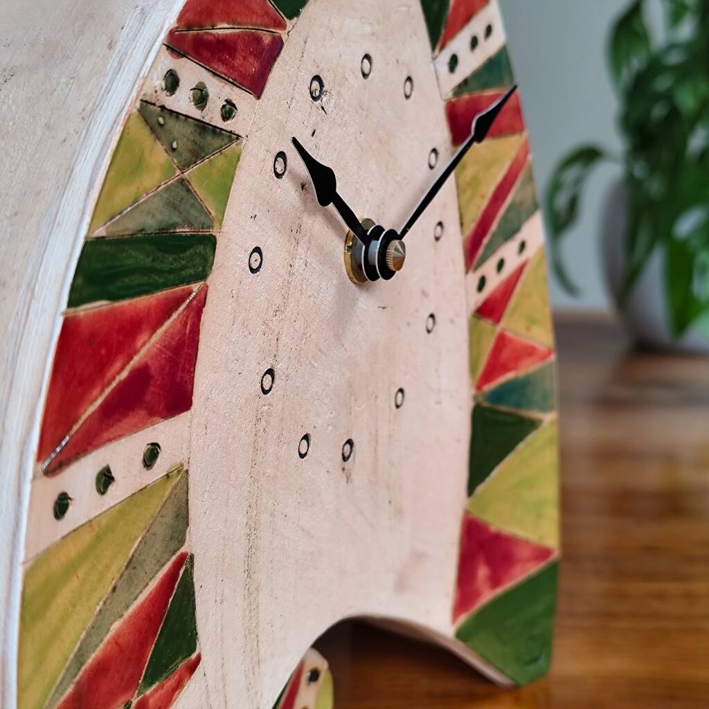 This handmade, unusual table clock is made from off-white clay and decorated with a geometric triangle pattern in burgundy and shades of green.