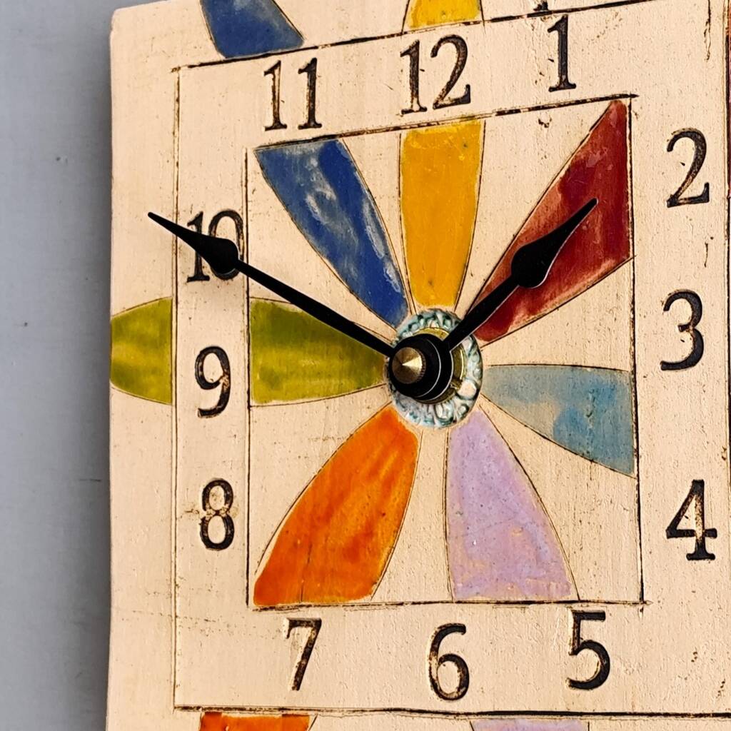 A unique handmade clock piece of art featuring vibrant multicoloured daisy petals on the clock face and larger numbers.