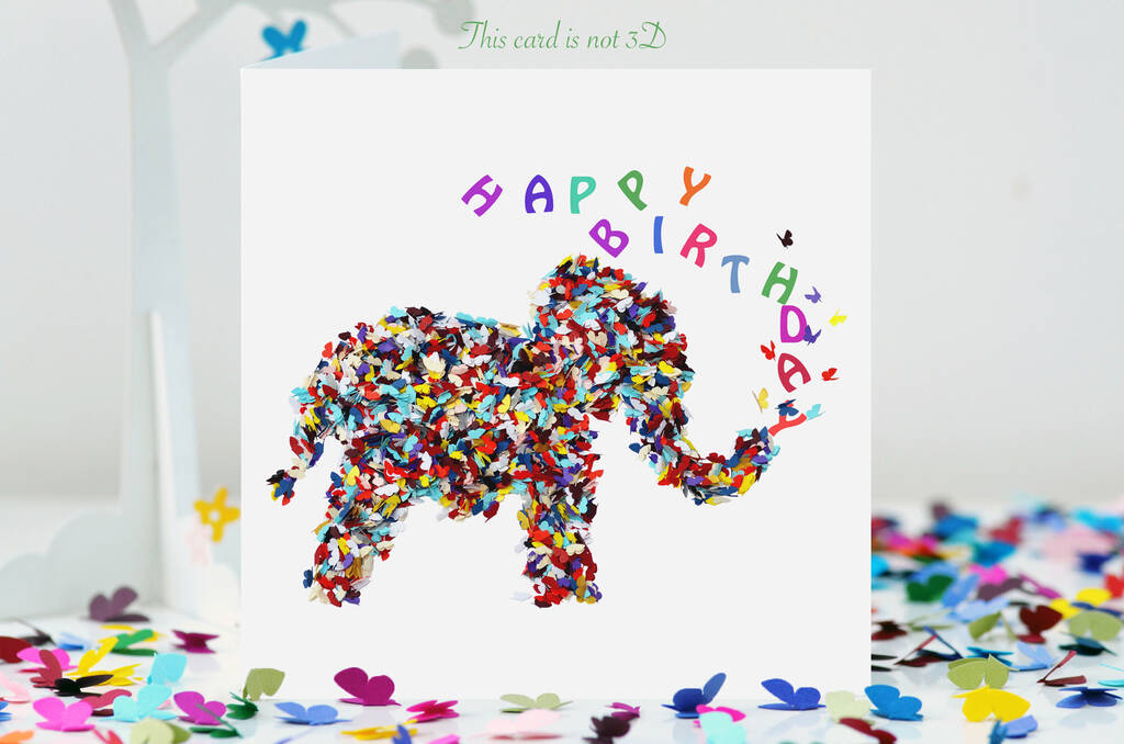 A butterfly elephant birthday card for all ages. Each butterfly represents love and this message is on the back of the card. It is digitally printed, not 3D