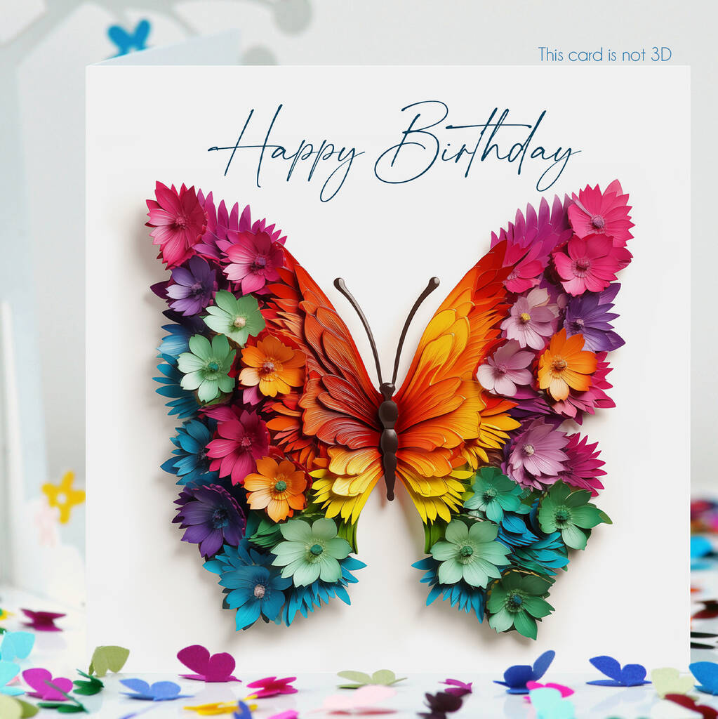 A birthday butterfly card with multicoloured flowers designed into the wings. Each butterfly represent love.The card is digitally printed, not 3D