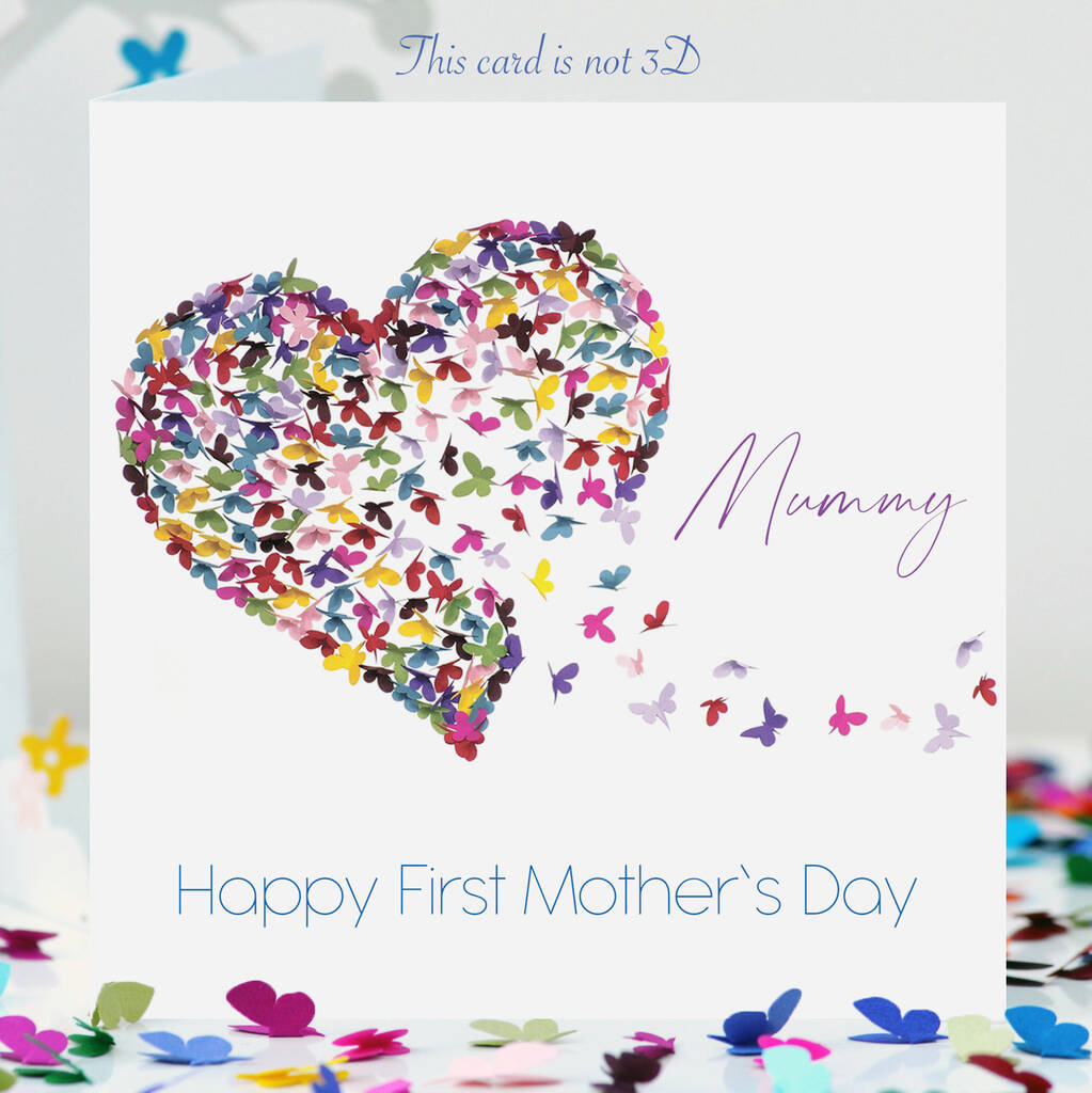 A first Mother's Day butterfly heart card. Each butterfly represents love and they fly into the heart to fill it and then flutter back out again to carry their love to others. This message is on the back of the card