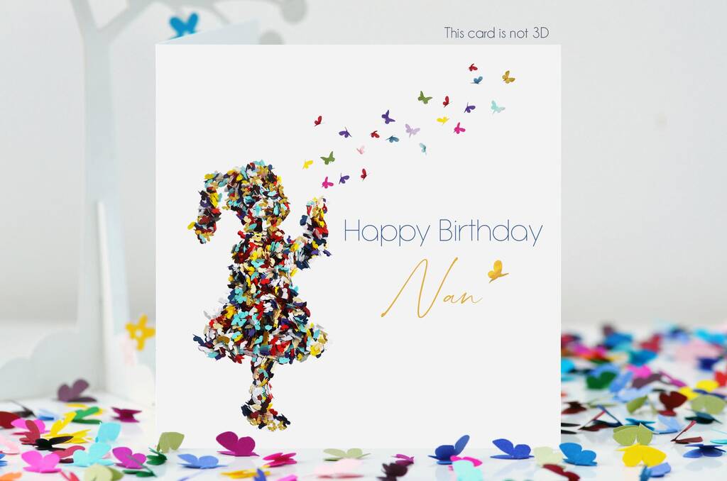 A Nan butterflies birthday card with multicoloured butterfly kisses being blown to her. Each butterfly represents love. Digitally printed, not 3D.
