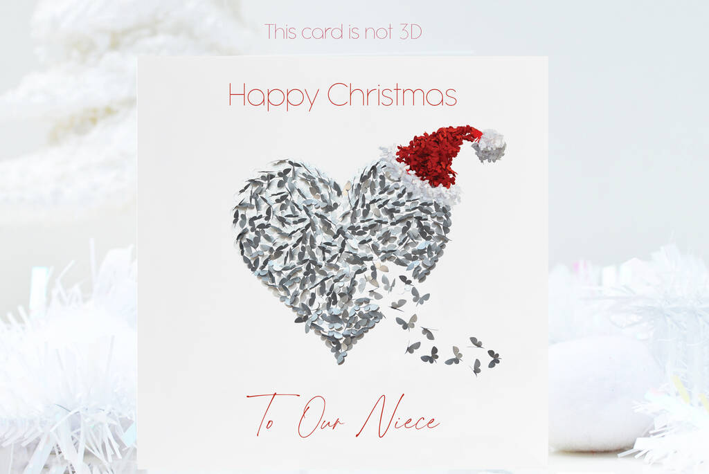 A Santa silver butterfly heart Niece Christmas card Each butterfly represents love. The card is digitally printed, not 3D