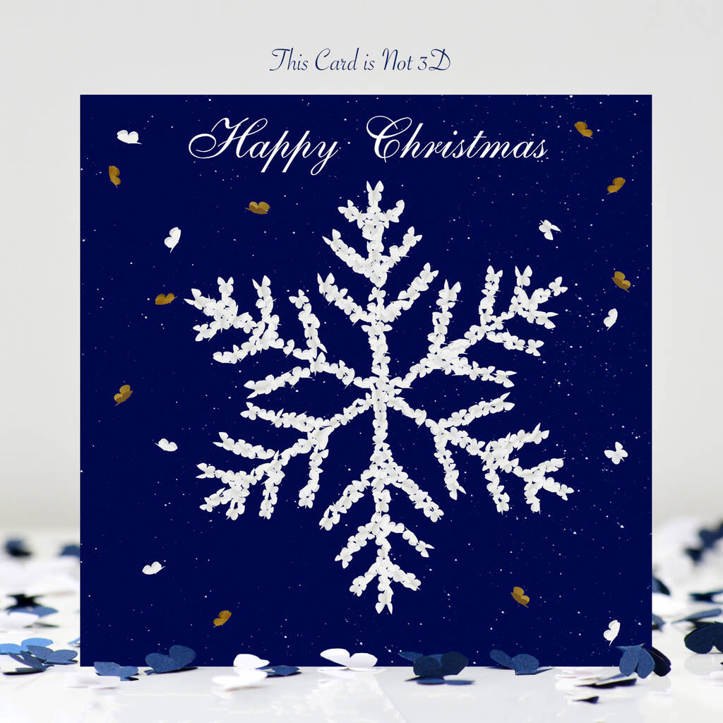 A white Christmas snowflake butterflies cards. The snowflake is formed from tiny white butterflies with others flying around. The background is deep blue. All the butterflies represent love and this message is printed on the back of the card. Digitally printed card, not 3D.