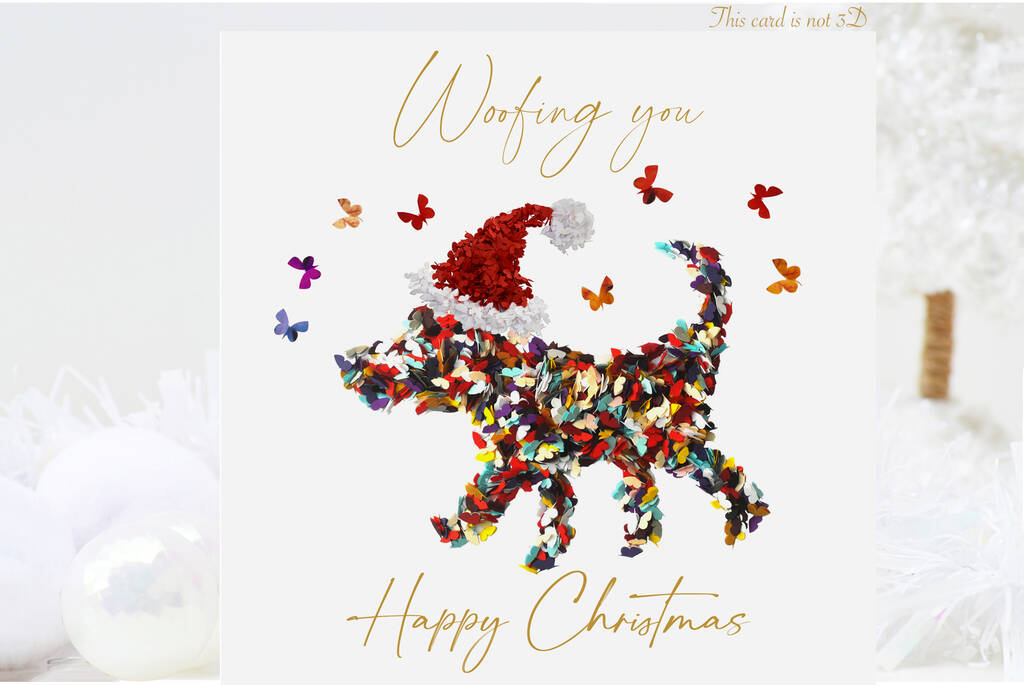 Woofing you Happy Christmas dog card with our doggy friend wearing Santa's Christmas hat and surrounded by butterflies. Each butterfly represents love and this message is on the back of the card.