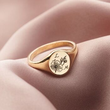 Engraved Birth Flower Initials Signet Ring