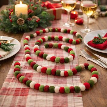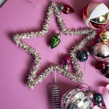For example, you can take traditional decorations like a tree topper and put your own spin on it. Think an oversized patchwork bow, a tinsel star, a light-up fairy or even a sloth. Because why not? And, instead of a traditional Christmas tree, you could even opt for an alternate version for your home, whether it’s a colour-in cardboard tree or a wall hanging. If you love tinsel but want something a little more sustainable, a garland can be a great alternative, from a string of handmade pom poms to sparkly fairy lights.