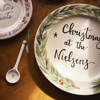 A centerpiece is a great starting point as you can use it to tie all your other decorations together, whether it’s picking a colour scheme or a general vibe. You could go classic with a wreath filled with candles or commission your own bespoke serving plate with your family’s name on. Mixing heights is also a great way to add more visual interest. Start with an elegant candle holder in the middle and add smaller decorations scattered around the table.