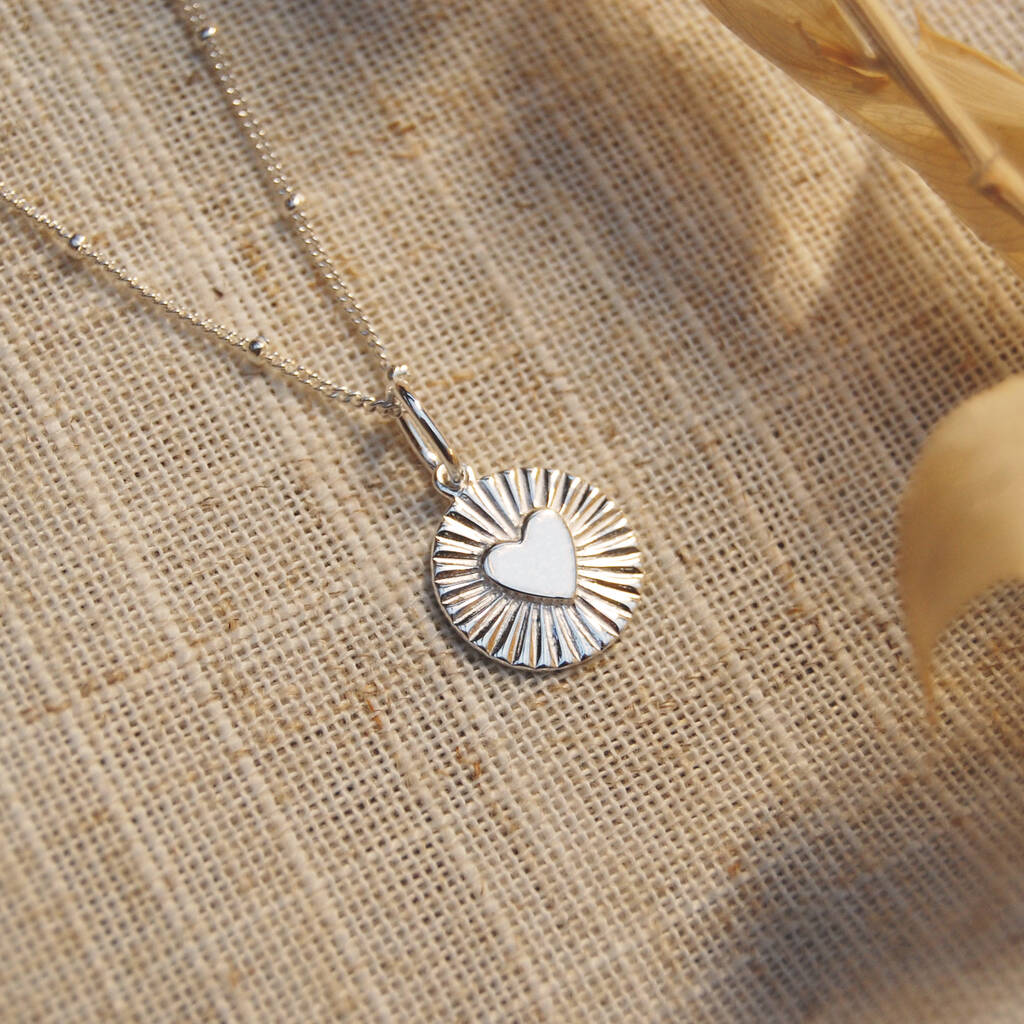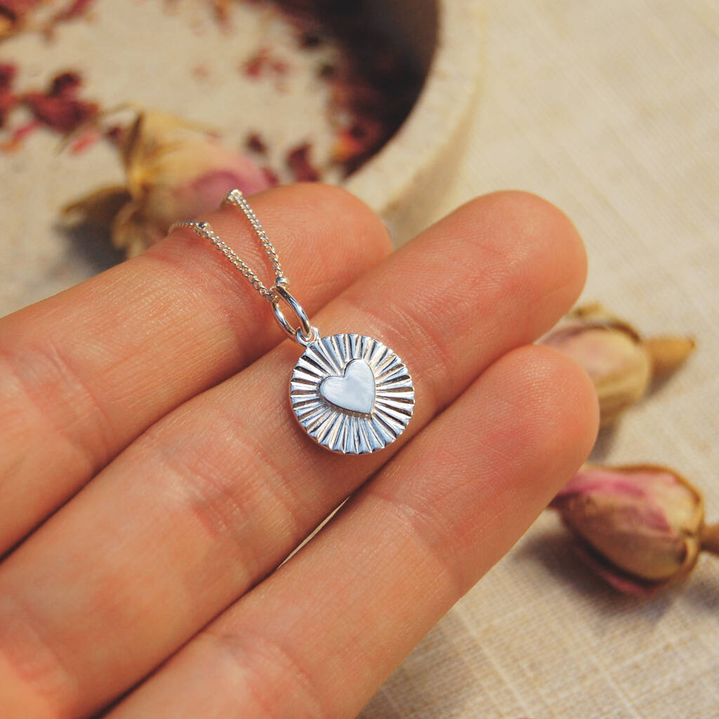 A stunning Sunburst Heart pendant in silver that can be personalised with any Initial to make it an extra special gift.