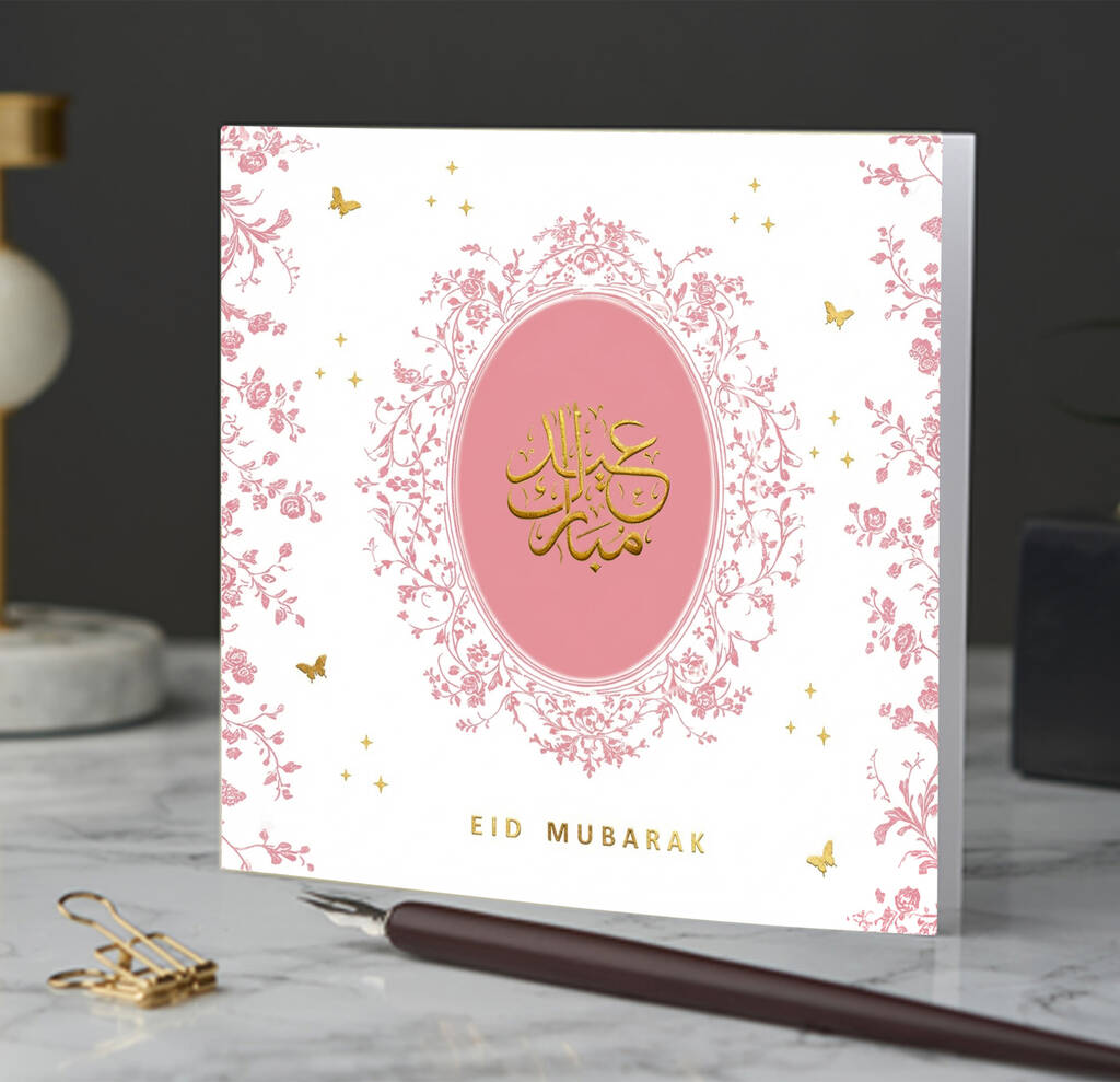 Wish someone dear a happy and blessed Eid with Islamic Moments elegant Eid Mubarak greeting card featuring gold foil detailing and an intricate floral background.