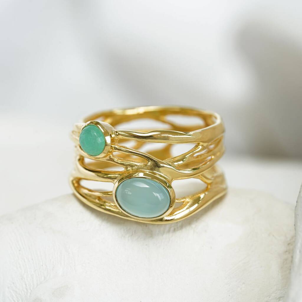 This statement Gold Vermeil ring features two eye-catching gemstones, an oval Aqua Chalcedony and small round Chrysoprase.The colour combination of soft blues and greens beautifully contrasts the gold, making this piece a standout addition to any women's jewellery collection.