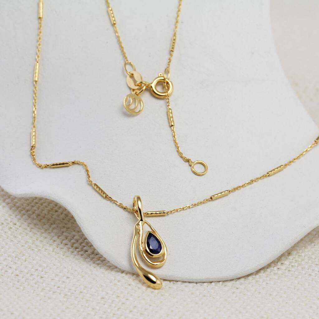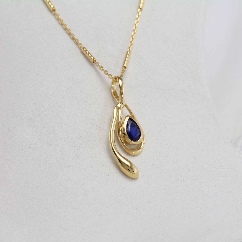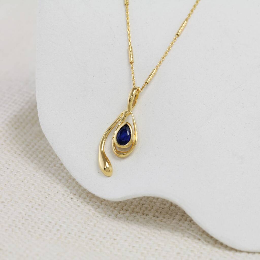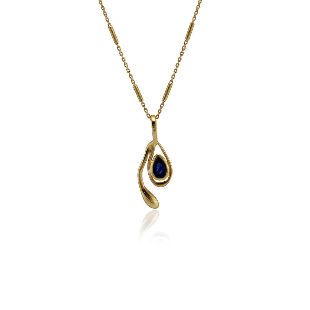 This delicate pendant is held by an adjustable dainty bar link chain. Made of 18KT Gold Vermeil, the pendant is made of sweeping strands of gold surrounding a teardrop cut Blue Sapphire. The contrast between the deep blue stone and the warm gold setting creates a striking harmony. Wearable at three different lengths, this beautiful piece is versatile enough for daily wear and special occasions.