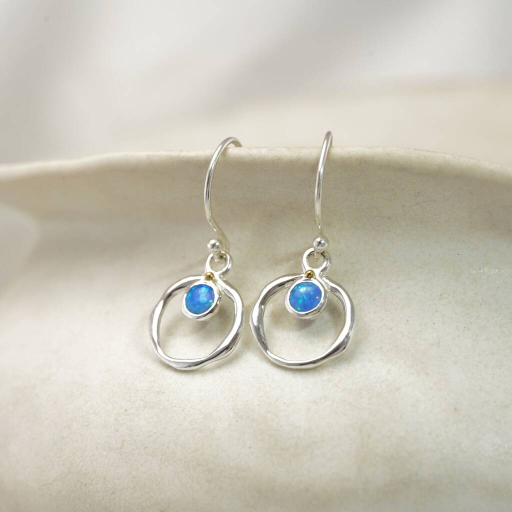 These dainty Sterling Silver drop earrings feature small, sparkling Opals inside a flowing circle of Silver. They make the perfect finishing addition to any attire, and are subtle while still adding a touch of colour.