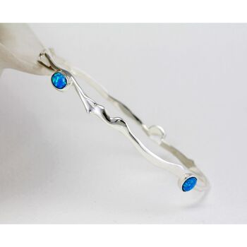 The delicate design of our Opal bangle makes it a subtle, elegant addition to any outfit. Three iridescent Opals are set in the natural flow of Sterling Silver, sparkling and catching the light in an array of hues. Featuring two vibrant blue Opals and one dainty white Opal, this bangle is a unique and intricately beautiful piece.