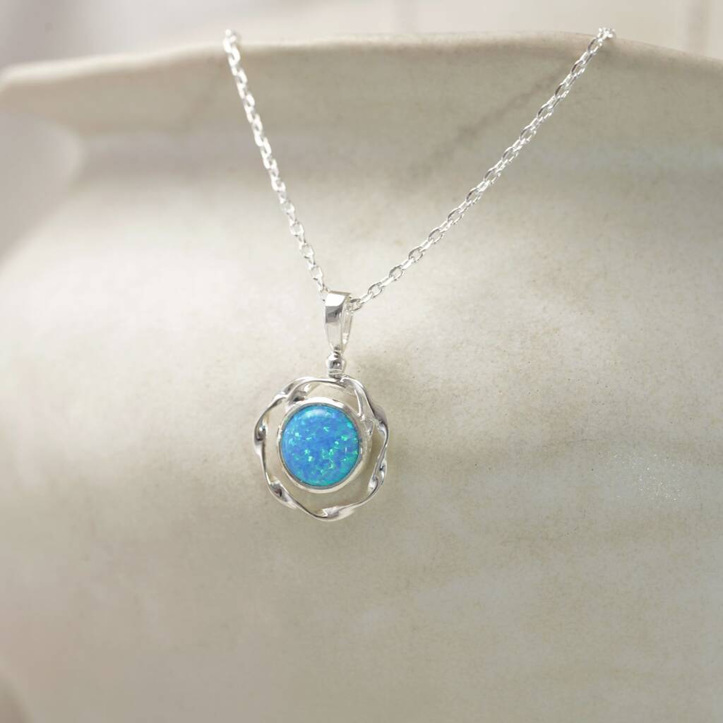 Set inside a swirling Sterling Silver circle is a beautiful round Opal, that shimmers in an array of turquoise hues.This pendant necklace adds a touch of colour to any jewellery collection and is the perfect versatile piece.