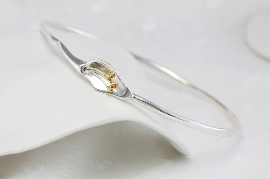 Handcrafted in Sterling Silver, this dainty bangle has touches of 18KT Gold.This elegant bangle features a subtle lily motif at its centre. The heart of the flower is highlighted with 18KT Gold, creating a harmonious and warm contrast with the flowing lines of the Silver band. A beautifully delicate and simple design, this piece is timeless and wears beautifully as an everyday piece. Handmade as a seamless, slip-on bangle for effortless wear.