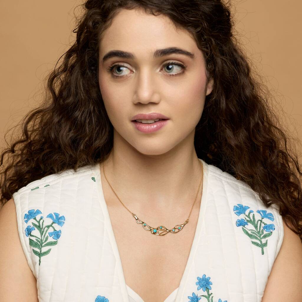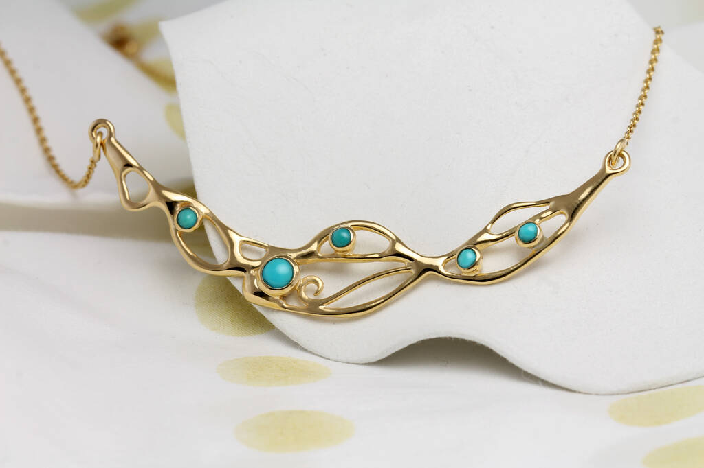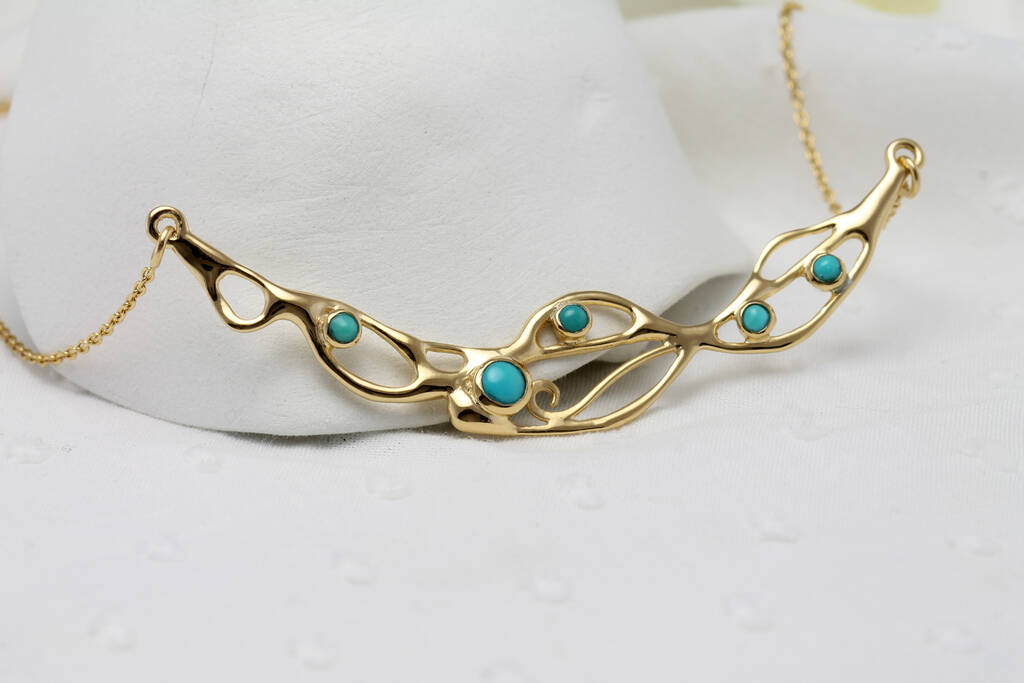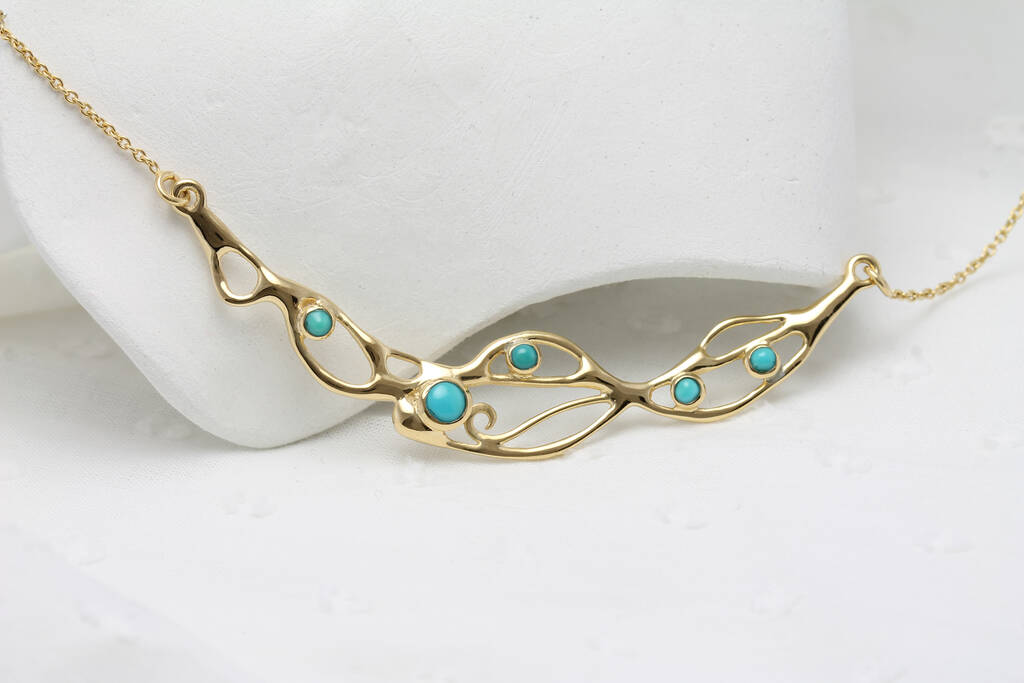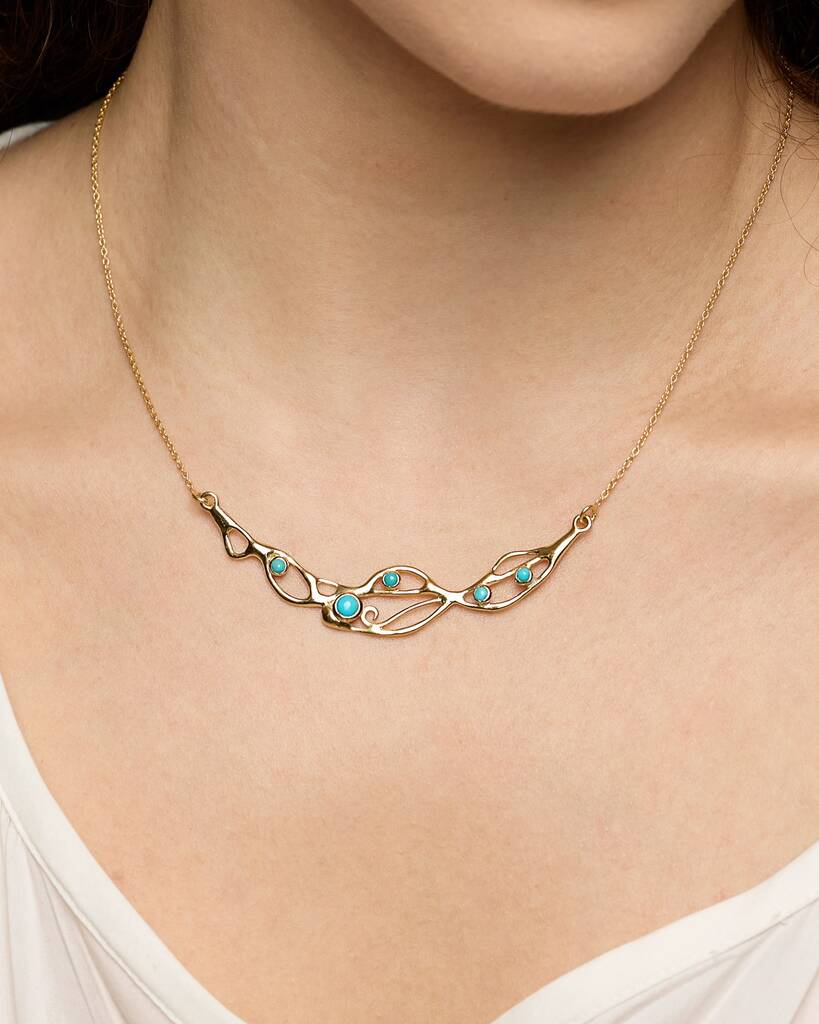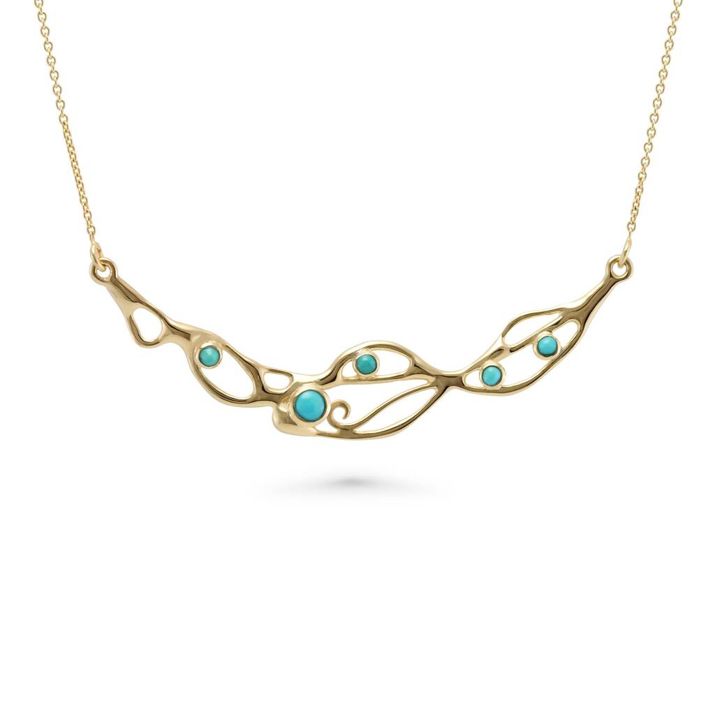 Handcrafted in 18KT Gold Vermeil, this beautiful necklace is set with five American Turquoise stones.This necklace carries an organic elegance that feels both contemporary and timeless. The setting flows with delicate detail, while five American Turquoise stones bring a beautiful contrast to the warmth of the Gold. With an adjustable chain, this necklace makes a beautiful statement on its own and is effortlessly versatile for everyday wear.