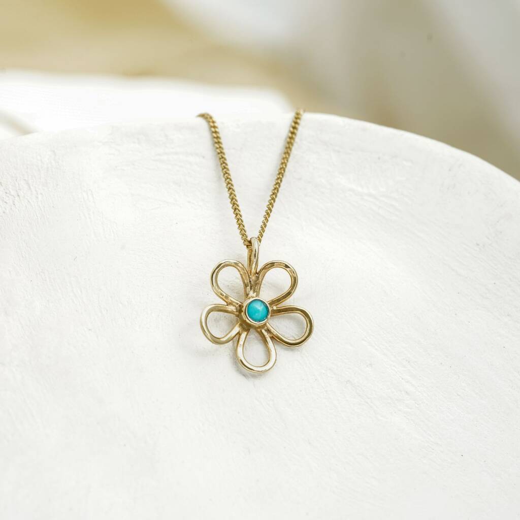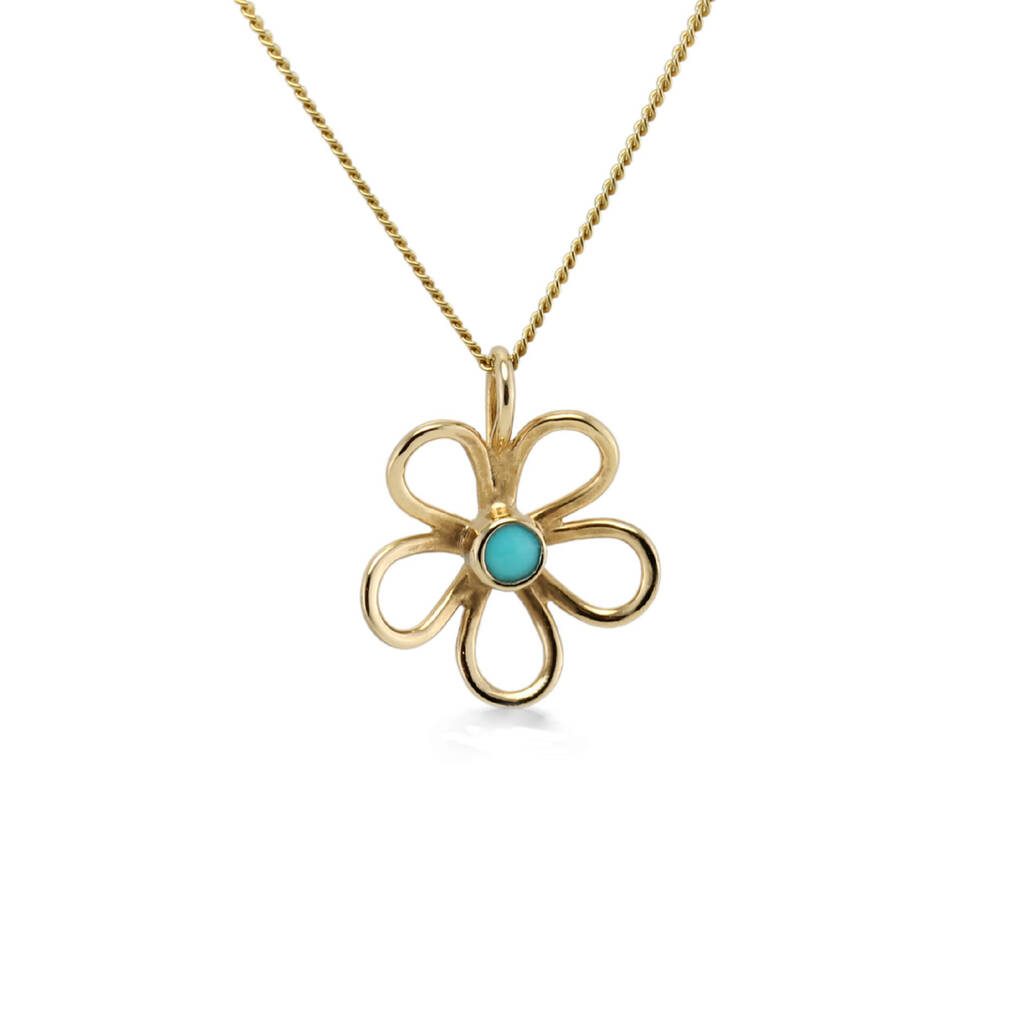 This dainty pendant is handcrafted from 18KT Gold Vermeil.This dainty pendant is handcrafted from 18KT Gold Vermeil. It features a lightly hammered flower design and in it's centre, a small round American Turquoise. The blue and gold perfectly complement each other, especially when paired with our matching earrings.