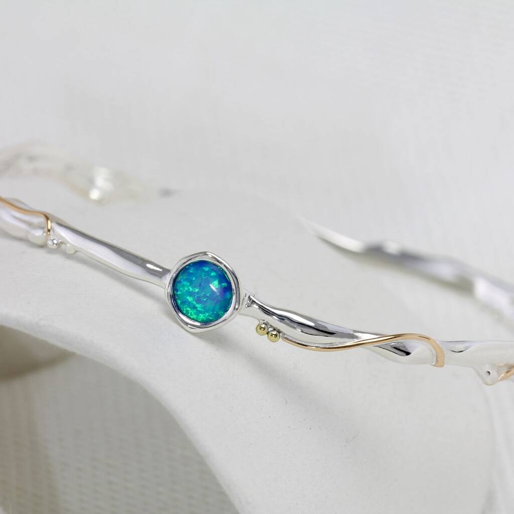 A delicate Sterling Silver bangle, set with a vibrant round blue Opalite and finished with 14KT Gold wire interwoven throughout.It's a beautifully dainty piece in a flowing, curving design, perfect for everyday wear.