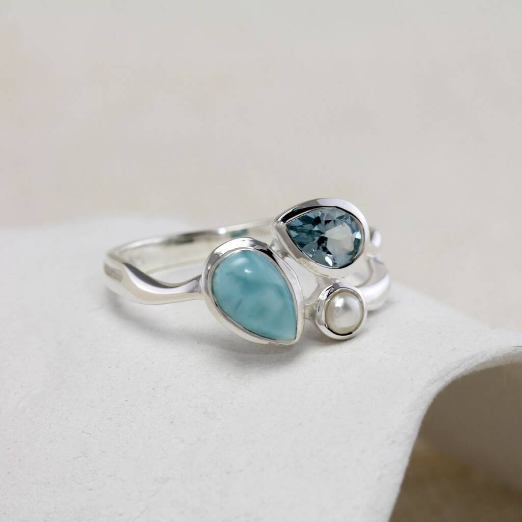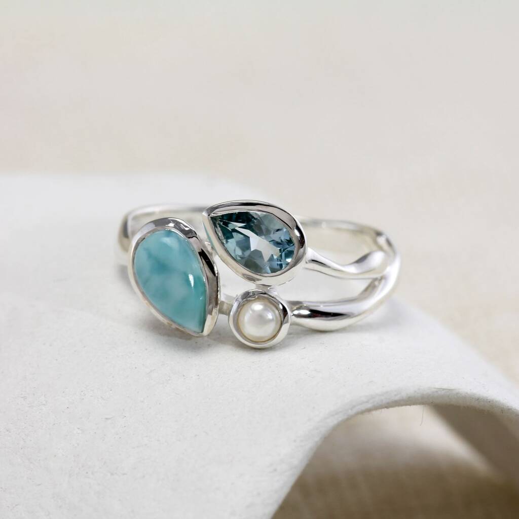 A flowing Sterling Silver ring with teardrop-shaped Blue Topaz, Larimar and a dainty Freshwater Pearl.A flowing Sterling Silver ring with teardrop-shaped Blue Topaz, Larimar and a dainty Freshwater Pearl.