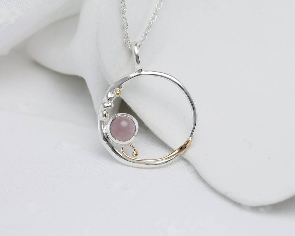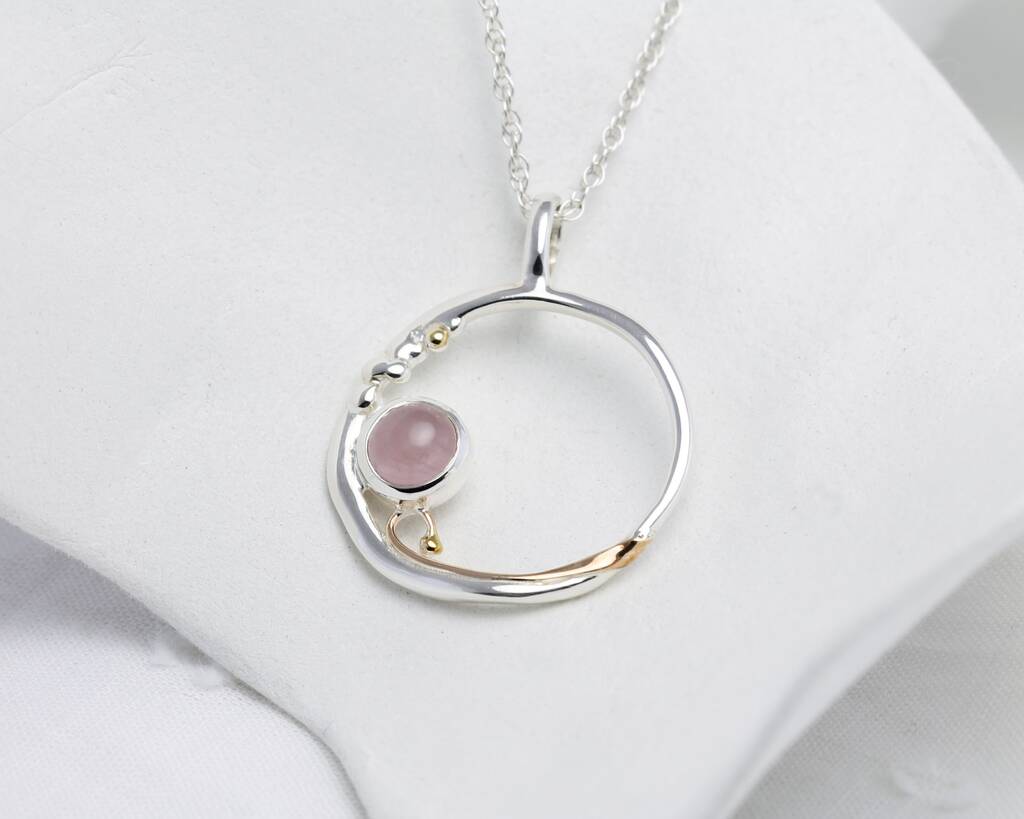 Handcrafted in Sterling Silver, this organically shaped pendant is set with a Rose Quartz. This adjustable necklace features a soft Rose Quartz delicately set to the side of a fluid Silver circle. Gold pips and threads add subtle touches of mixed metals, giving the pendant a unique, layered character. This piece captures an effortless balance between contemporary artistry and timeless design, perfect for layering or wearing alone as a statement piece.