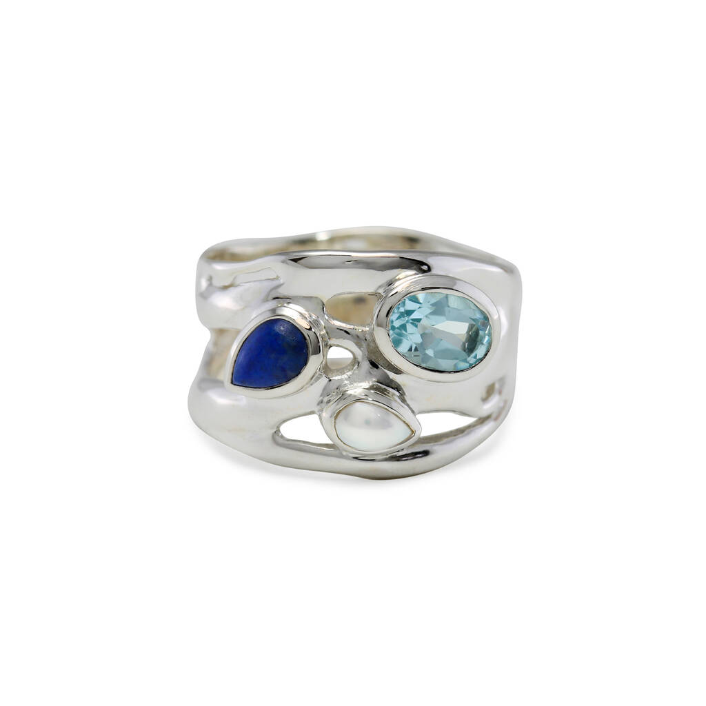 Make a statement with this multi-gemstone ring. Nestled amongst the flowing Sterling Silver sits a sparkling Blue Topaz, teardrop Lapis Lazuli and delicate Freshwater Pearl.It makes a thoughtful gift for her and a beautiful addition to any women's jewellery collection.