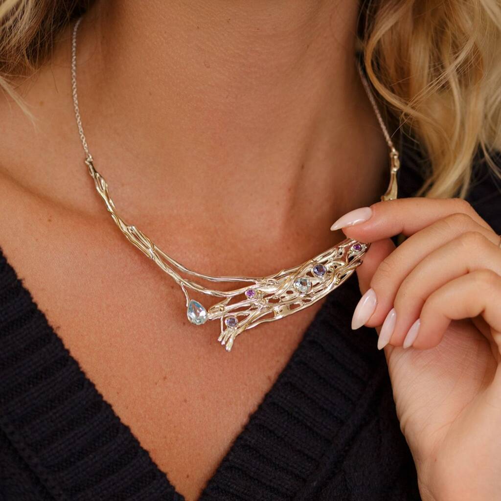 Sterling Silver Gemstone Statement Necklace with Blue Topaz, Amethyst and IoliteA truly unique statement necklace. Each gemstone is carefully curated, featuring blue Topaz, Iolite and purple Amethyst, expertly set on this handcrafted Sterling Silver necklace.