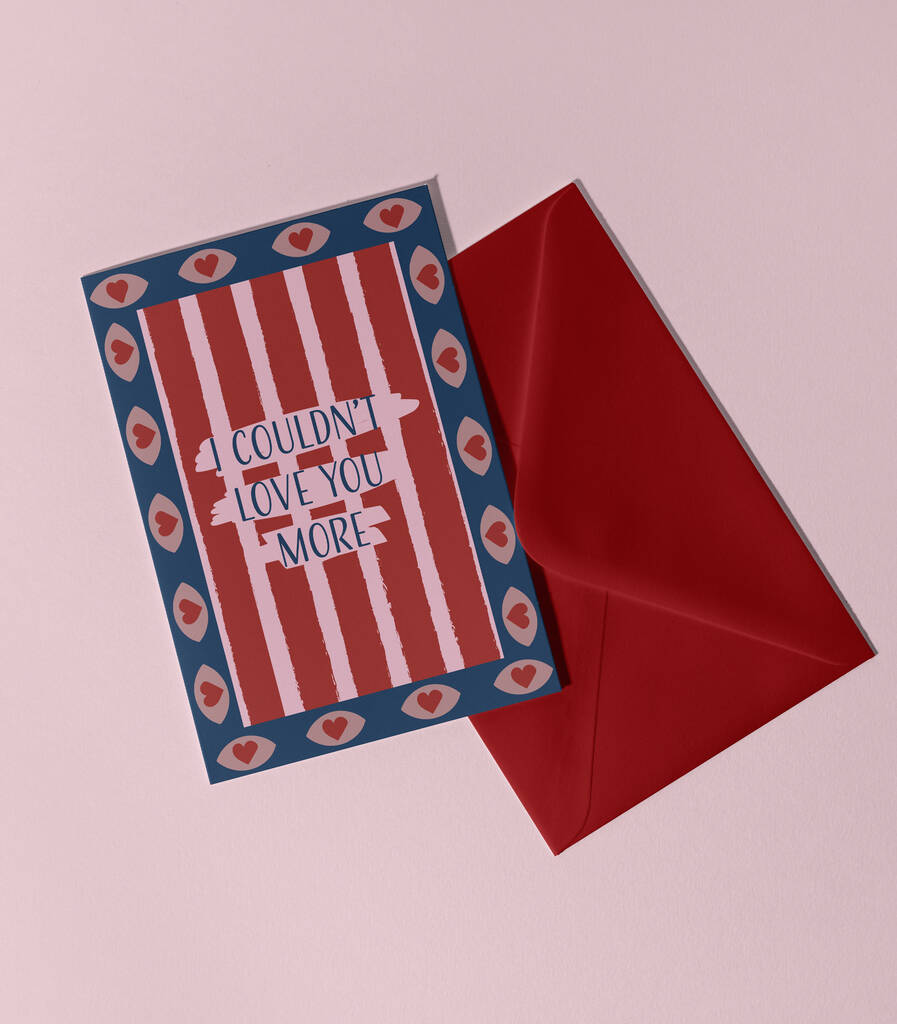 This bold Valentine’s Day card features hand-painted style stripes, soft pinks and deep reds, and a playful heart border.A perfect card for Valentine’s Day, anniversaries, or just because, this card is a lovely way to tell someone how much they mean to you - whether that’s a partner, spouse, or someone you adore beyond words.