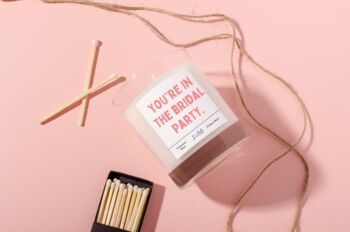 A great bridesmaid gift! The candle reads 'you're in the bridal party' in bold red letters on a premium white label.