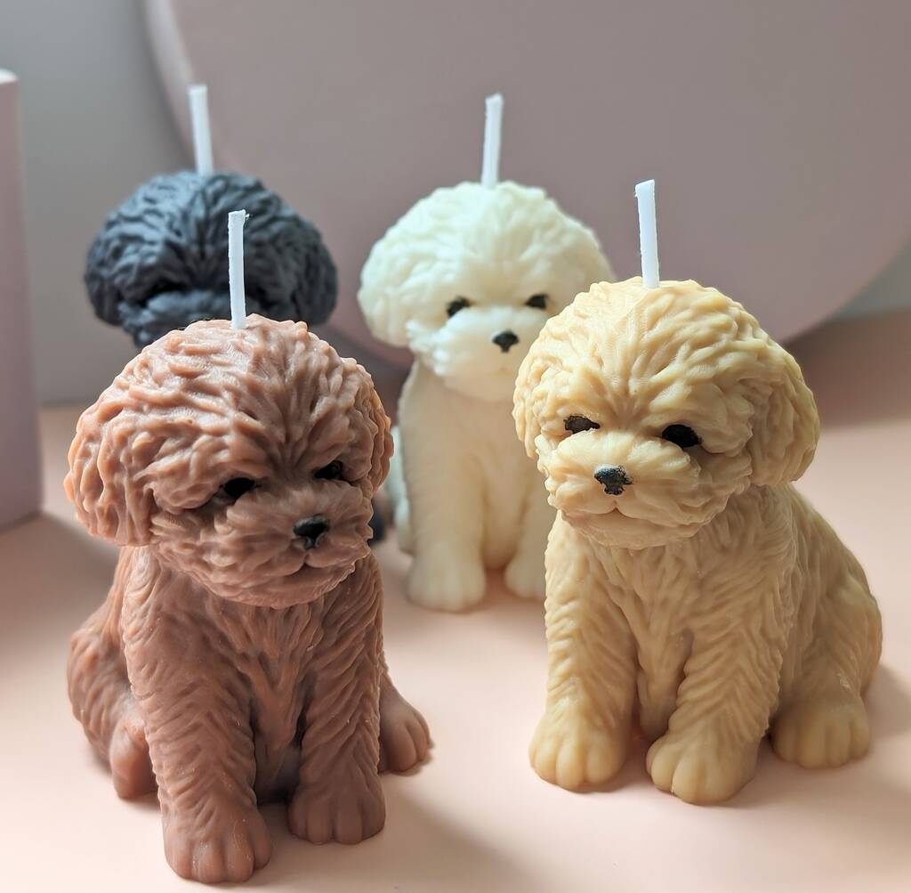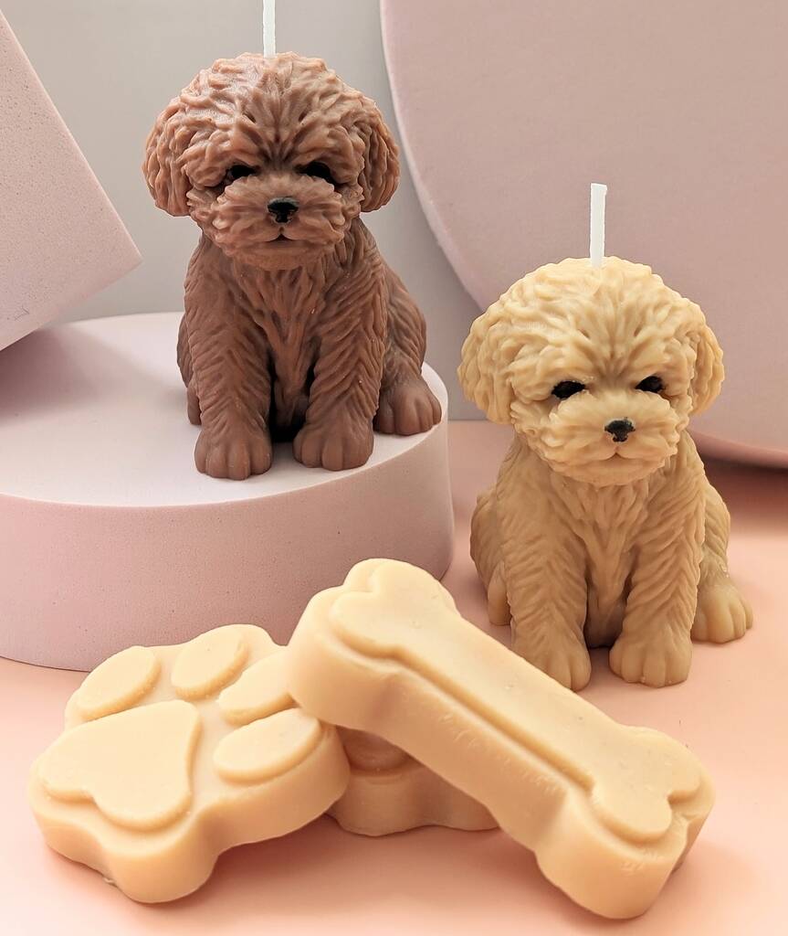 The candle and 3 wax melts shaped like a bone and paws in the same colour and scent as your pup.