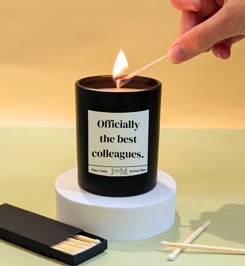 A great graduation gift. The candle reads 'officially the best colleagues' in bold black letters on a premium white label