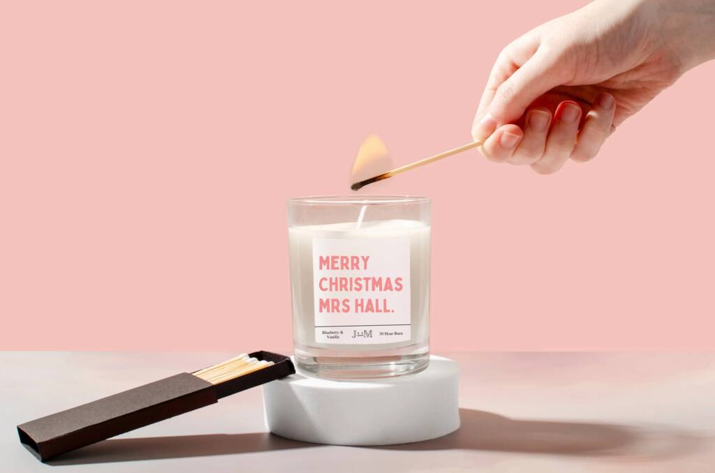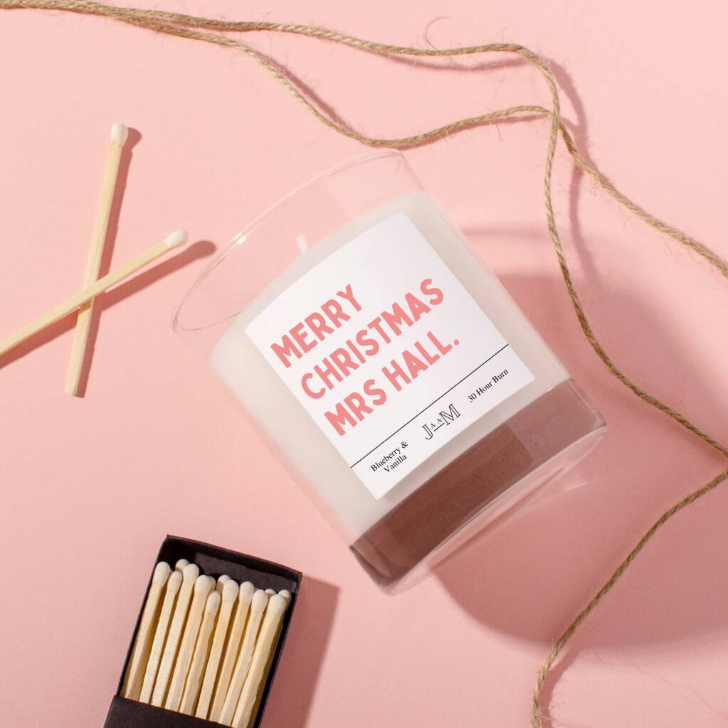A personalised Christmas gift. The candle reads 'Merry Chritsmas ...' in red letters on a premium white label. You can personalise the name.
