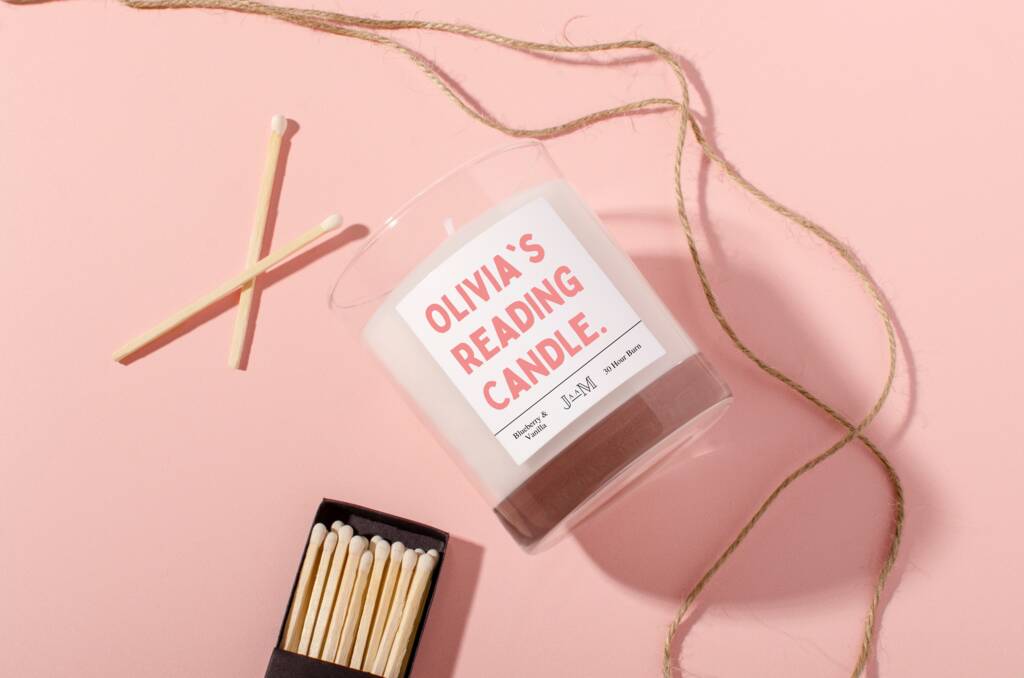 A personalised reading candle. The candle reads '....'s reading candle' in red letters on a premium white label. You can personalise the name.