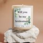 A stunning luxury candle for a bridesmaid. The candle reads 'will you be by bridesmaid? on a beautifully designed glossy label.