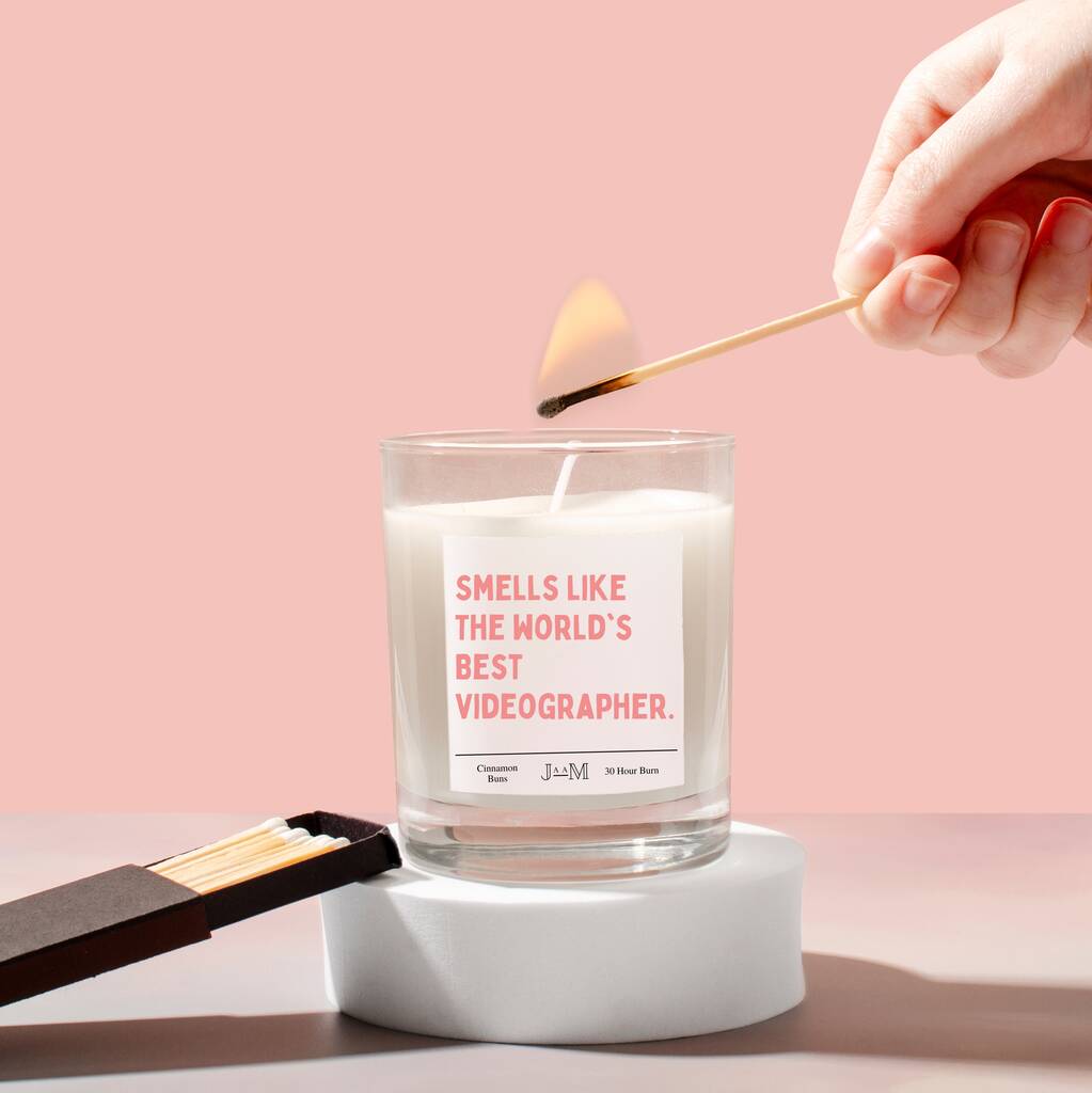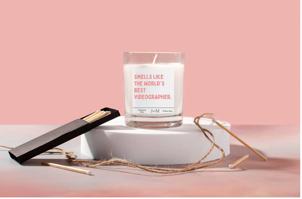 A great gift for a videographer. The candle reads 'smells like the worlds best videographer' in bold red letters on a premium label.